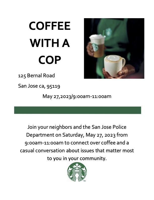 Starbucks at Bernal Rd and Via Del Oro (between Staples and Lucky) is inviting the neighborhood to “Coffee with a Cop” on Saturday, May 27, 9:00 to 11:00 am. This is an opportunity for a casual meeting with San Jose law enforcement to discuss issues that matter to our community. Starbucks will have coffee, snacks and some activities for kids as well.This is an opportunity for a casual meeting with San Jose law enforcement to discuss issues that matter to our community.