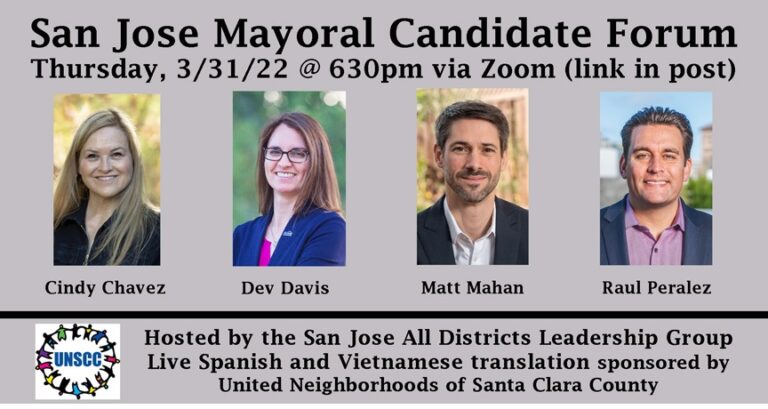 Candidates in alphabetical order: Cindy Chavez, Dev Davis, Matt Mahan, and Raul Peralez. Don’t miss out! The San Jose Mayoral Candidate Forum brought to you by district neighborhood leaders! Hosted by the San Jose All Districts Leadership Group. Questions based on community input and moderated by district neighborhood leaders from throughout San Jose! Live Spanish and Vietnamese translation sponsored by United Neighborhoods of Santa Clara County (UNSCC).