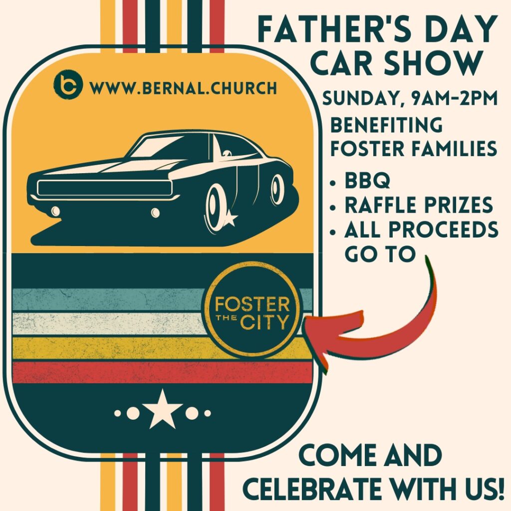 Entrance is free. Raffle with many prizes suitable for all ages! Come enjoy the show, have some BBQ. Donations encouraged! All proceeds go to the organization, Foster the City Register your ride at https://bernal.church/fathersday2025