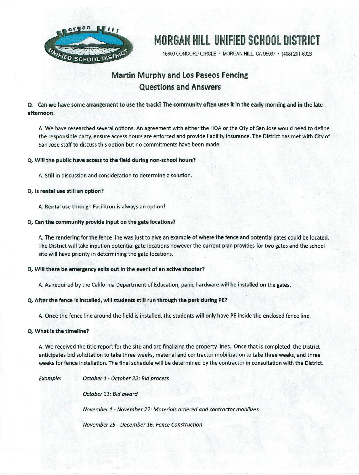 • Martin Murphy & Los Paseos School security fencing – September 5, 2019 meeting